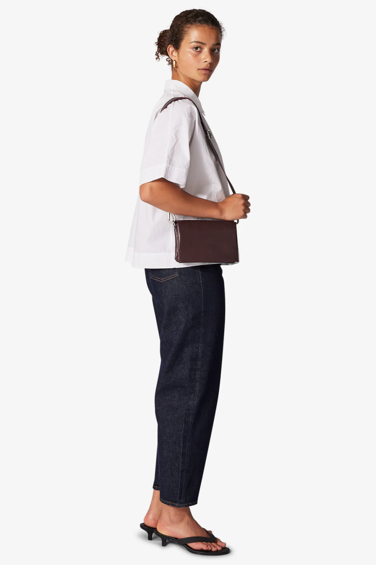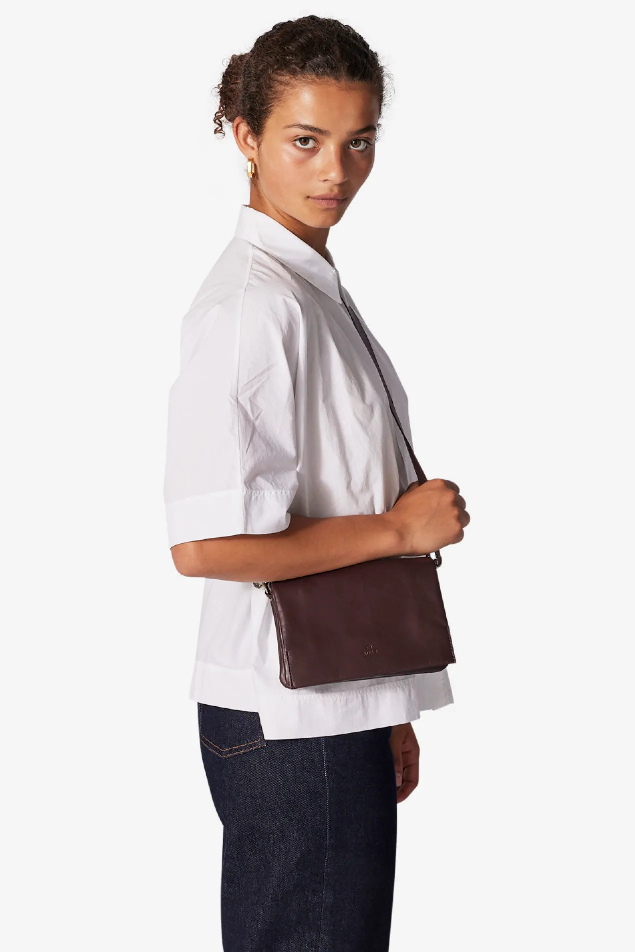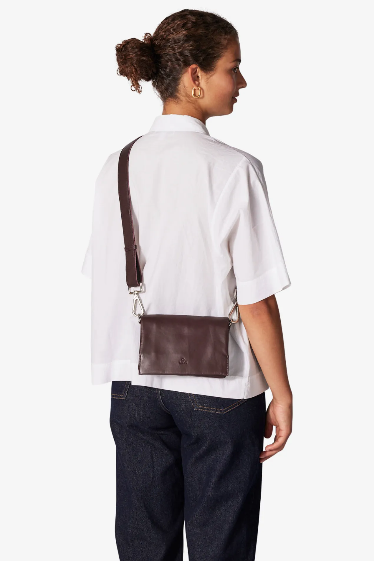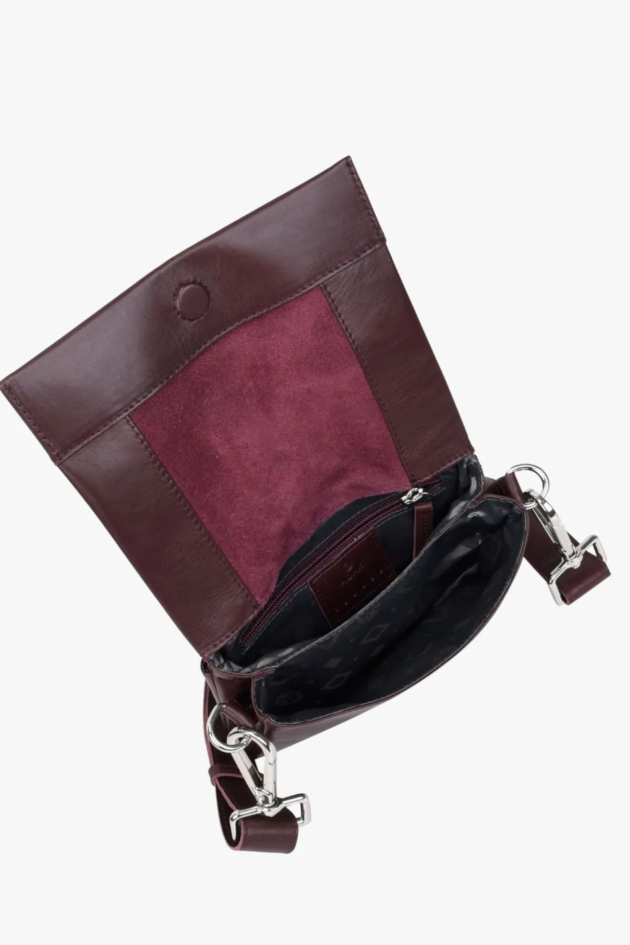 Franca is the perfect bag for everyday use.The inside space is divided into two compartments with a smaller flat zippered pocket placed in the lining of the one compartment.The bag I closed with a leather flap covering the full surface.On the backside the bag has a narrow compartment for e.g. the mobile phone or other things easy to grab on the go. This compartment closes with a magnetic button.The bag has a long and wide detachable leather strap which is adjustable in length for the perfect fit.