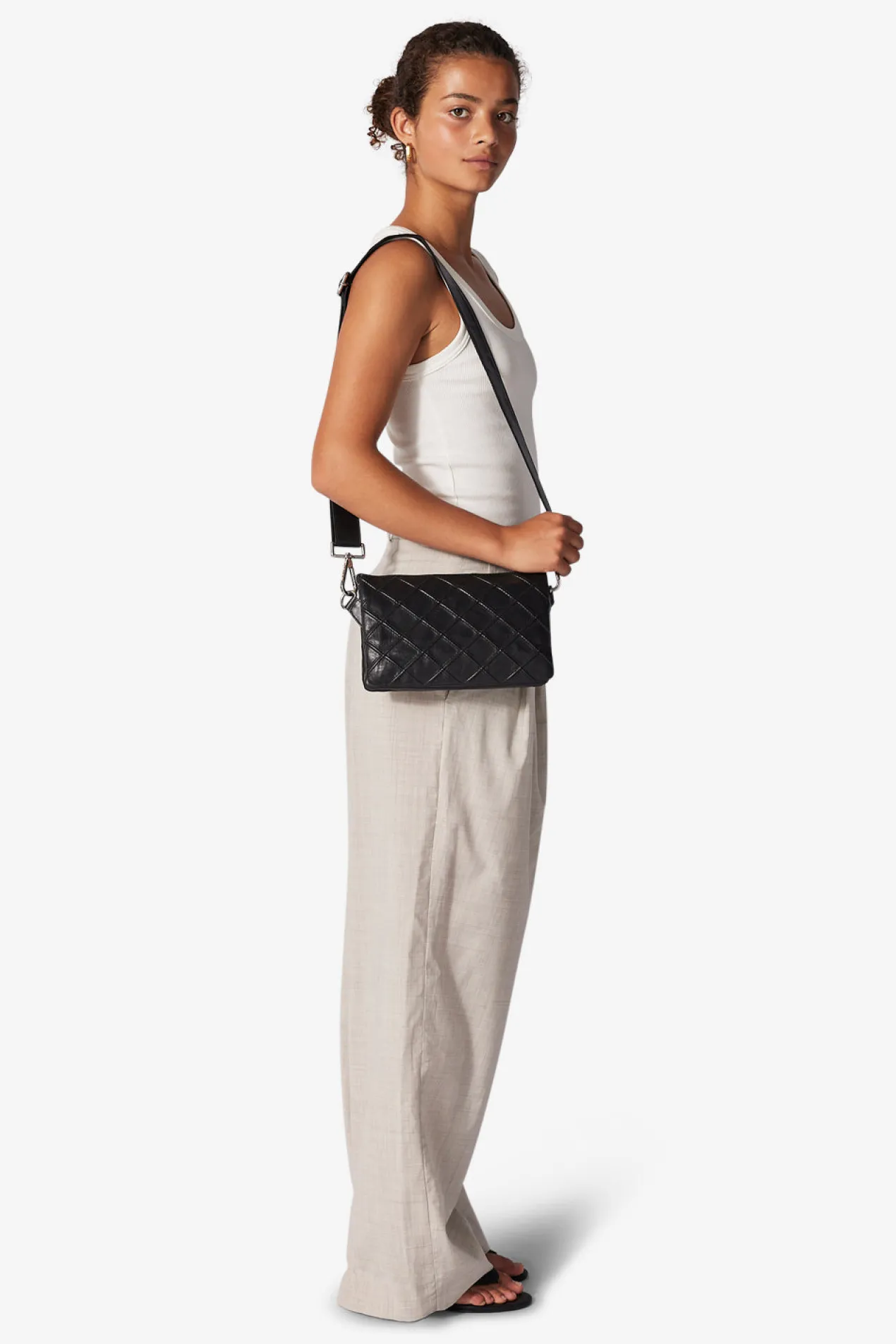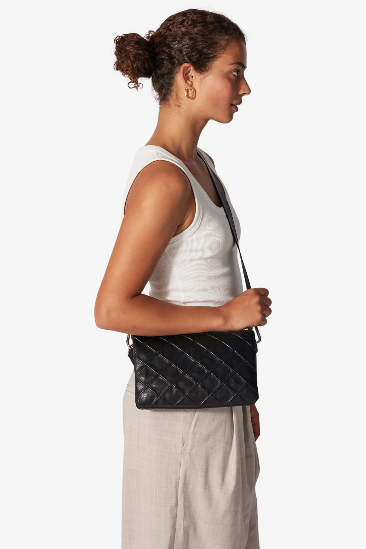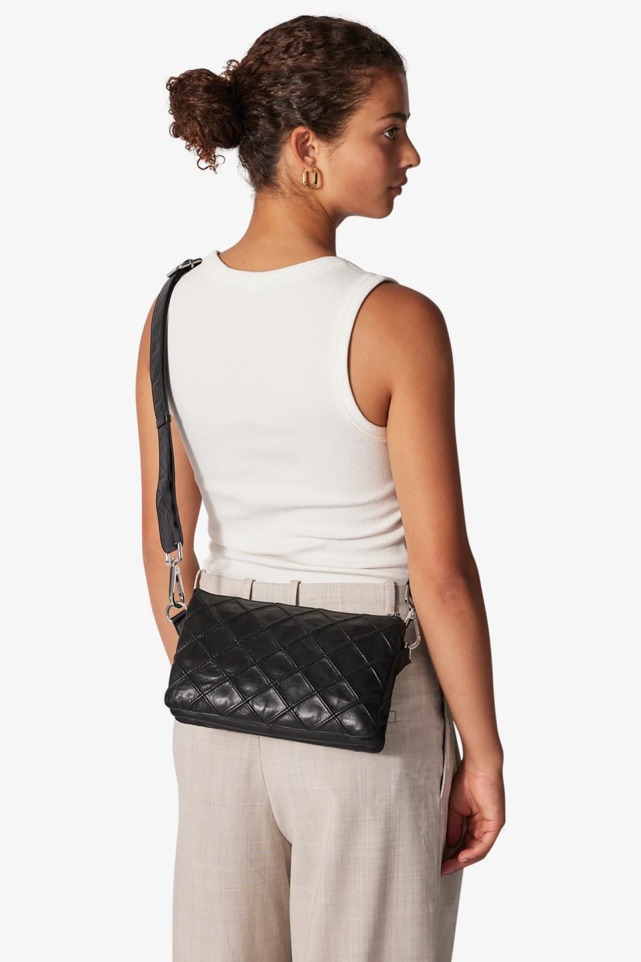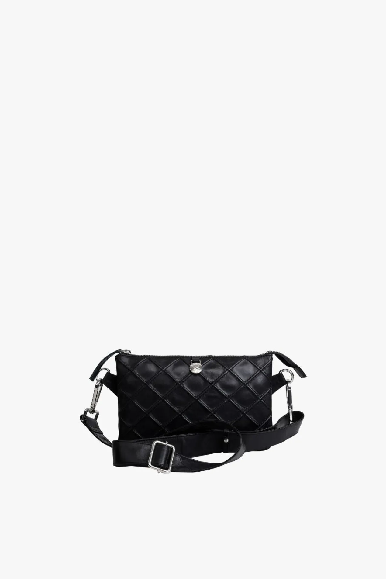 Gisele shoulder bag with a beautiful quilted check pattern in Amalfi leather by Adax. Functional and spacious shoulder bag with adjustable strap that allows the bag to be used as a crossover. The bag closes with a zipper at the top of the bag. There are four open compartments, zipper compartments and an inside zipper pocket and an open leather pocket. The bag comes with a tote bag and a warranty leaflet that can be used as a card holder.
