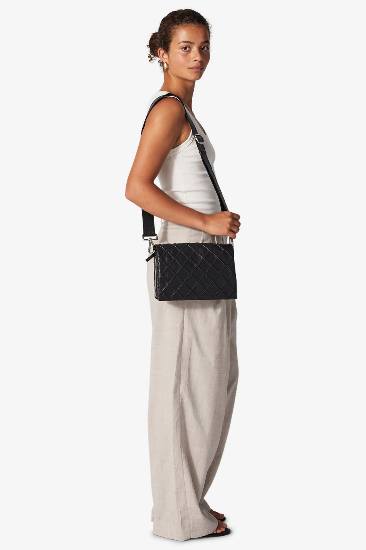 Hedwig shoulder bag in quilted Amalfi leather by Adax. Smart little shoulder bag in a very soft leather, which can be used as a crossover as the long strap is adjustable. The bag consists of 2 open compartments separated by a small zipper pocket, the bag closes with a flap with magnet closure. In one compartment there is a small zipper pocket and in the other an open leather pocket. There is also an open pocket on the back that closes with a hidden magnetic button. A small tote bag is included with the bag, as well as a warranty leaflet in the same quality and color as the bag. It can be used as a card holder.