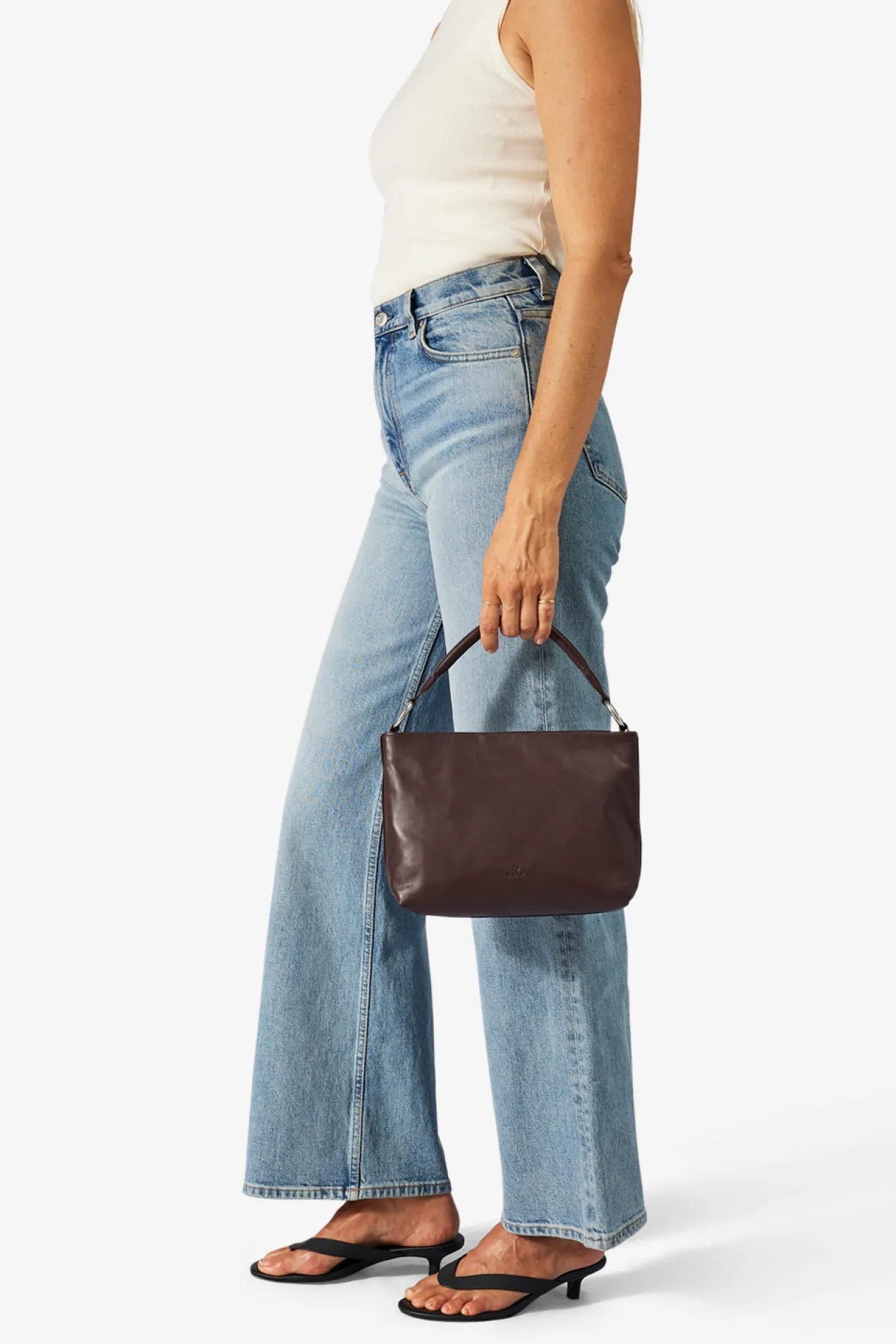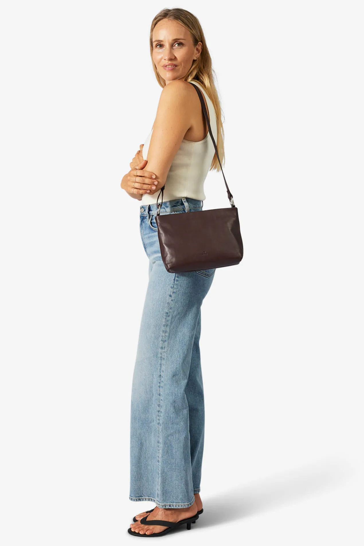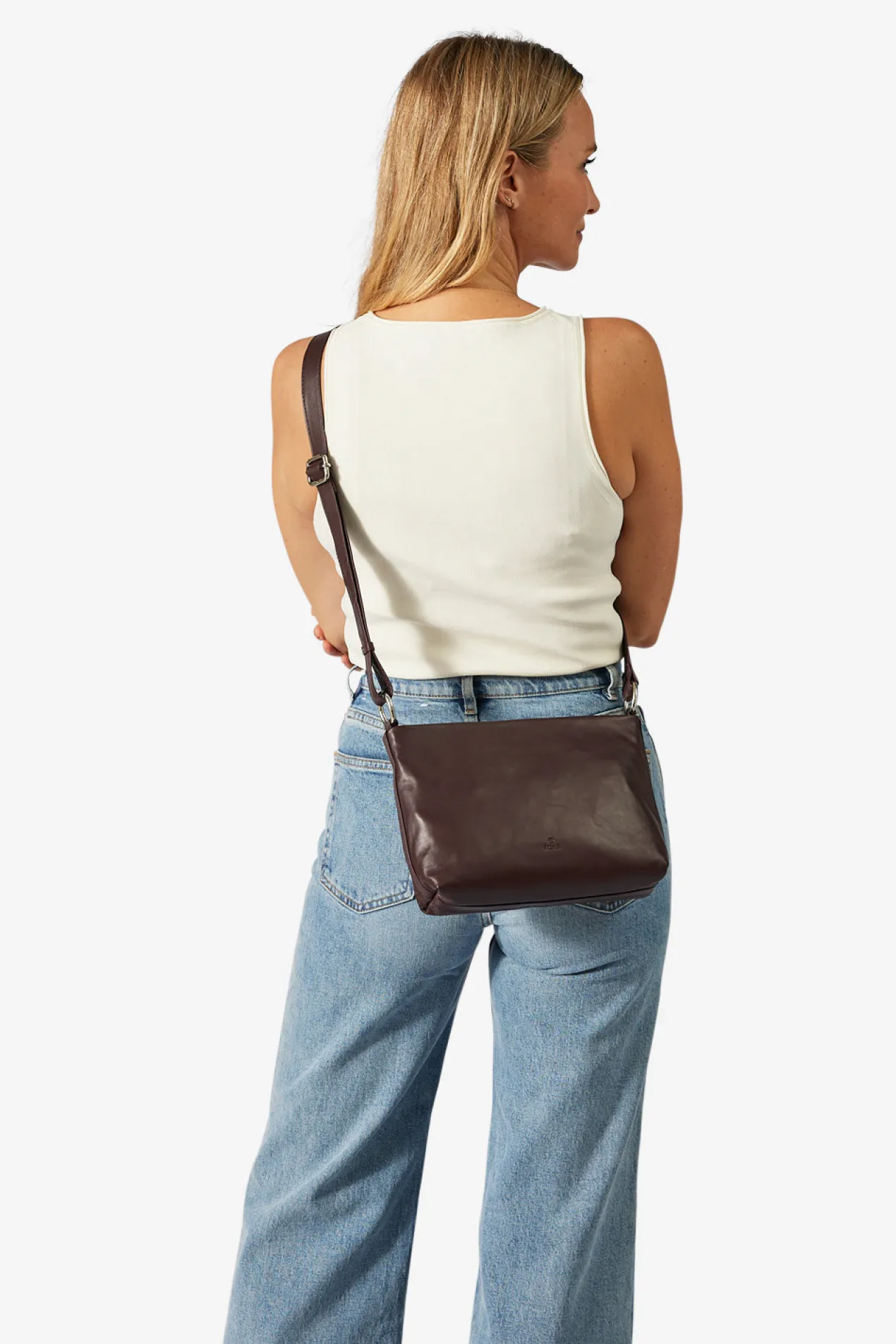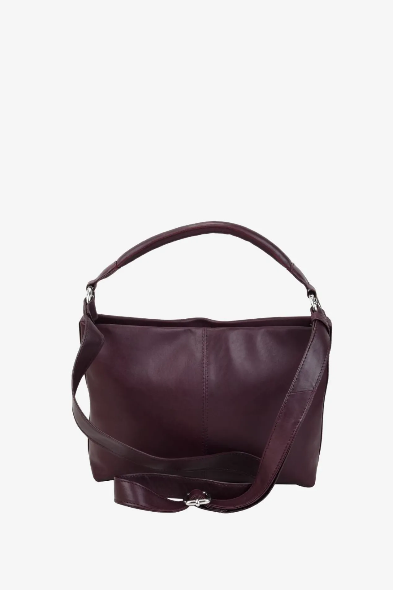 Klara shoulder bag in Amalfi leather from Adax. Klara comes with both a long adjustable strap and a short carrying handle. Both are removable, so you have the option to remove one of the straps. The bag closes at the top with a zipper closure. Inside there is one large compartment with an open leather pocket on one side and a small zipper pocket on the other. The bag comes with a tote bag and a small warranty leaflet that can be used as a card holder.