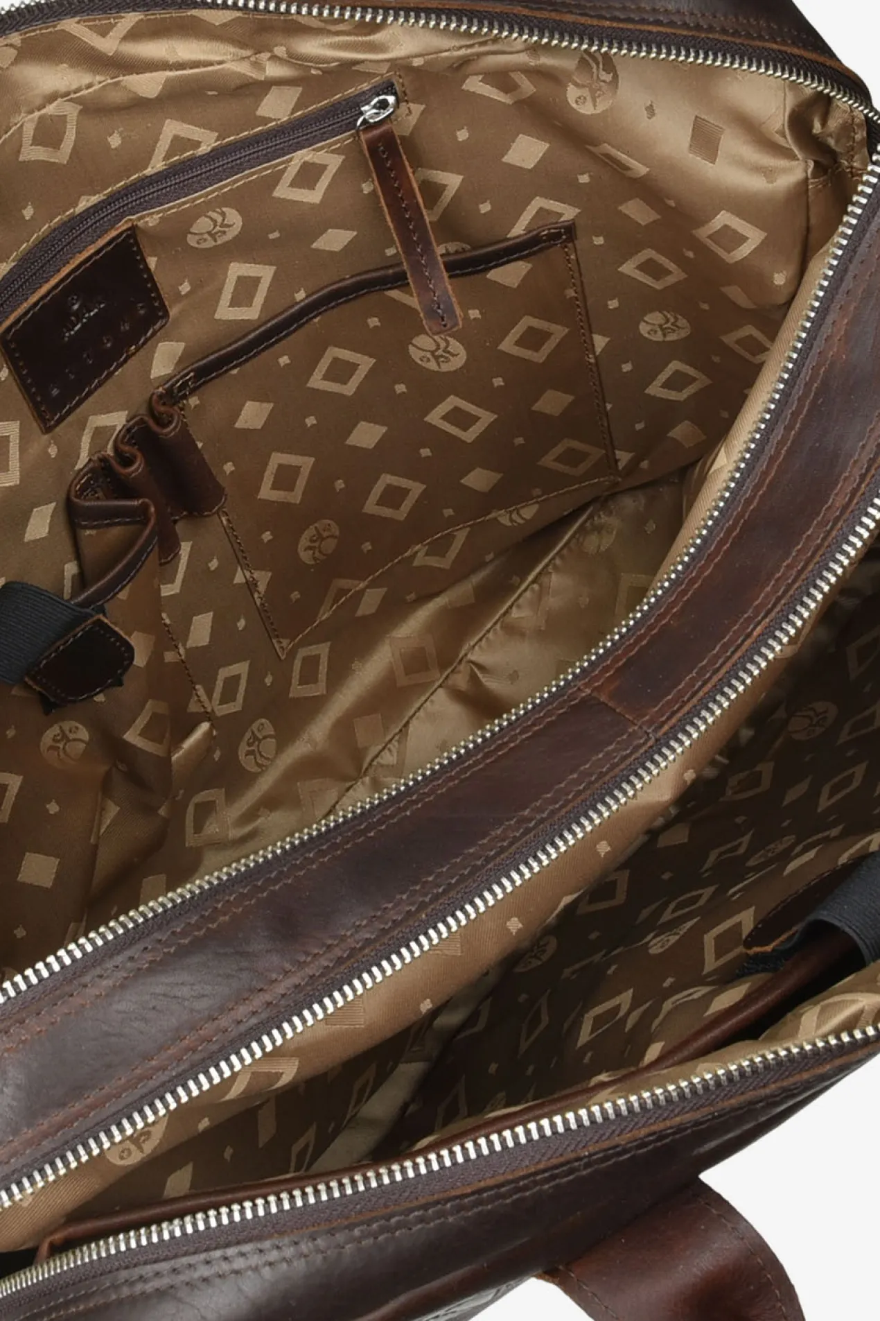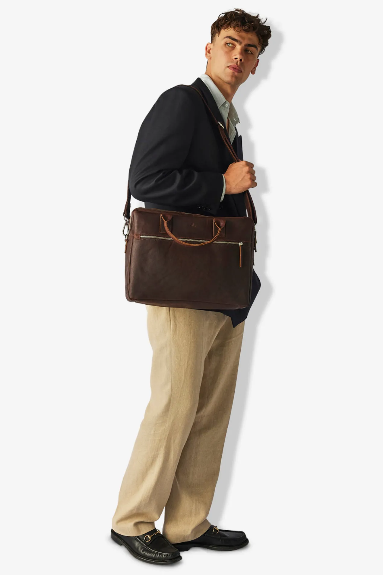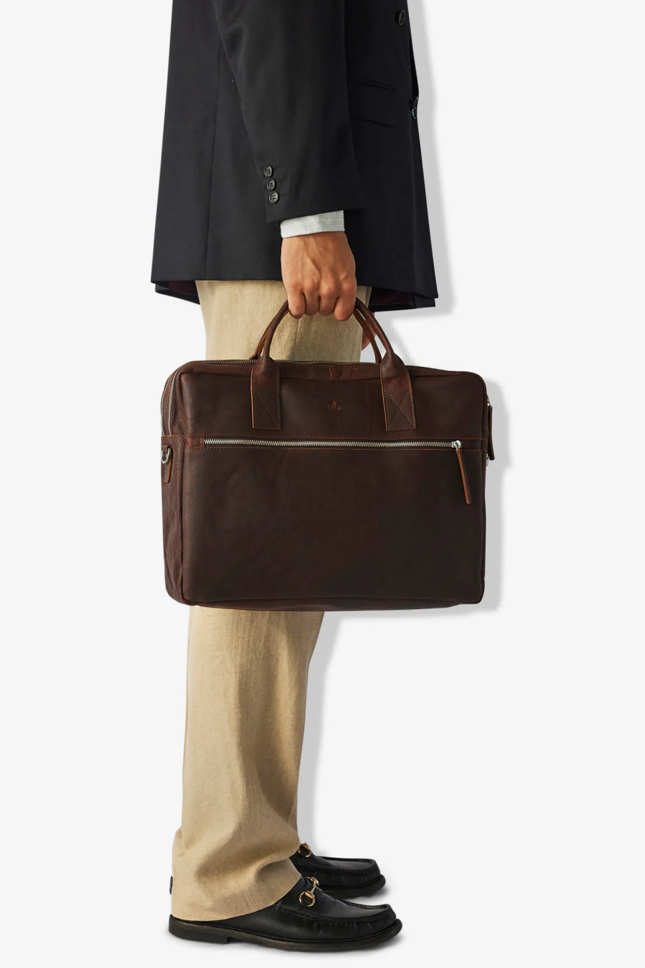 Axel is a great and simple briefcase in high quality leather, with enough room for what you may need to carry with you in your everyday life.The bag has two large compartments, which are both closed with a zipper. Axel can be carried in the two handles or in the detachable and adjustable shoulder strap. The outside features a zip pocket on the front, with great room for a wallet, keys etc.The inside features two large rooms; one with a pocket for a laptop with Velcro closure and one with a small zip pocket, two open pockets and two leather penholders.